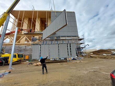 Tutte le attività, dall'ingresso alla partenza delle merci, vengono svolte nell'edificio centrale. Holzbau Amann è stata responsabile della produzione e dell'assemblaggio degli elementi in legno per la struttura portante, le pareti a telaio e la facciata. Con un'altezza di 24 metri dal livello del suolo, l'edificio rientra nella classe di costruzione 5, il che significa che ha requisiti speciali di protezione antincendio che sono stati soddisfatti in consultazione con l'esperto e i produttori degli elementi costruttivi utilizzati.
