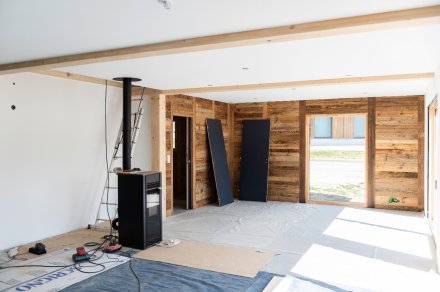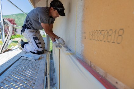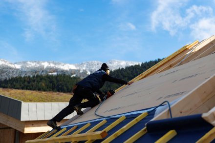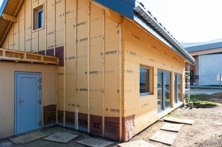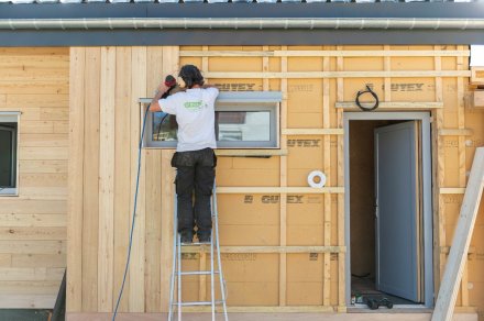 Cette maison individuelle à un étage avec un plan de près de 120 m² mise sur le bois à l’intérieur comme à l’extérieur pour profiter au maximum des propriétés de ce matériau naturel. La structure de base de la maison planifiée conformément aux exigences de la RT2012 est une construction en ossature bois massif traditionnelle. Étant donné qu’il était très important pour le maître d'ouvrage de répondre systématiquement aux exigences d’une construction écologique et saine, les façades, la toiture et les murs ont donc été équipés d’isolants en fibres de bois : les ossatures des façades ont été pourvues de panneaux isolants souples Gutex Thermoflex d’une épaisseur de 160 mm tandis que l’épaisseur de ces panneaux dans les chevrons était de 220 mm. Sur le plateau alpin du Vercors, cette solution d’isolation certifiée ACERMI et KEYMARK peut faire preuve de tous ses avantages puisque, grâce à sa faible conductivité thermique de seulement 0,036 W/mK, Gutex Thermoflex