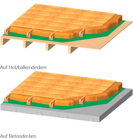 Il sistema di isolamento Stampio consiste in una struttura priva di ponti termici che può essere facilmente installata su quasi tutti i soffitti esistenti. Il cuore del sistema è costituito dai piedini isolanti Stamp, resistenti alla pressione, che sono allineati parallelamente e in linea con il soffitto esistente. Grazie al loro preciso profilo di scanalatura, accolgono ordinatamente i listelli di supporto montati in parallelo. Su questi listelli di supporto viene fissato un rivestimento del pavimento in pannelli a base di legno o in cotto. L'isolamento in fibra di legno Thermofibre viene collocato senza soluzione di continuità tra il soffitto esistente e il rivestimento del pavimento.